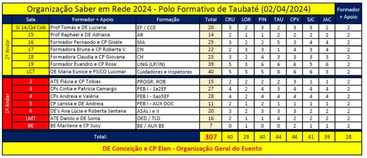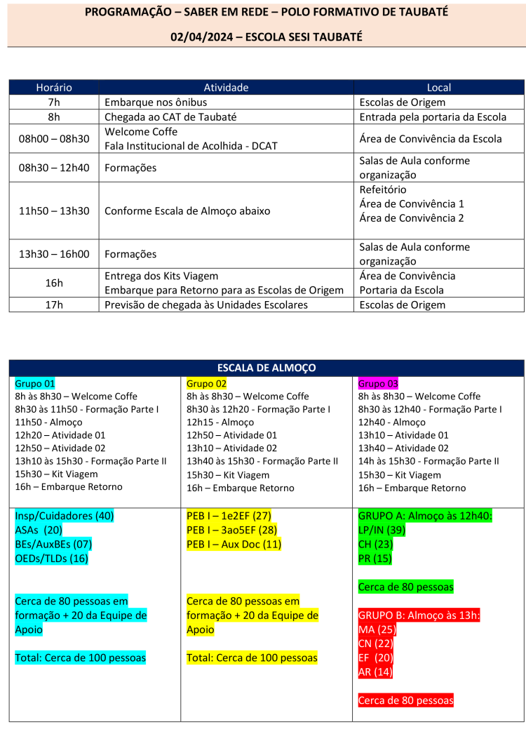Confira aqui a Programação final do Evento Saber em Rede a ser realizado no próximo dia 02/04/2024, na Escola SESI Taubaté, bem como a logística dos espaços para conhecimento de todos: